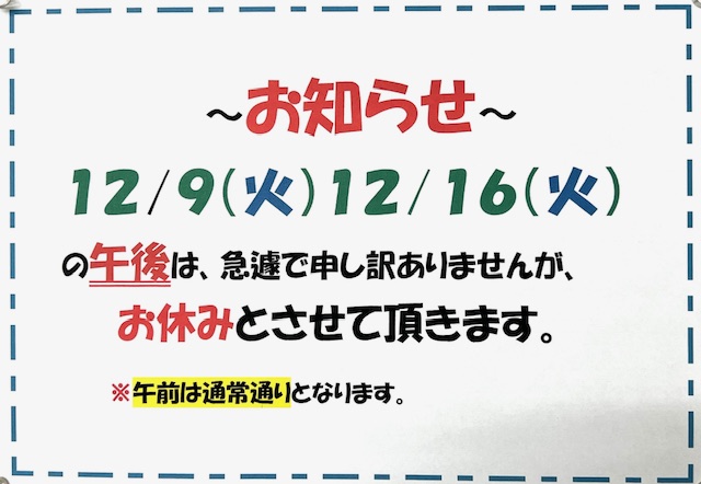 12/9(火)と12/16(火)の両日とも午後がお休みとなります。
