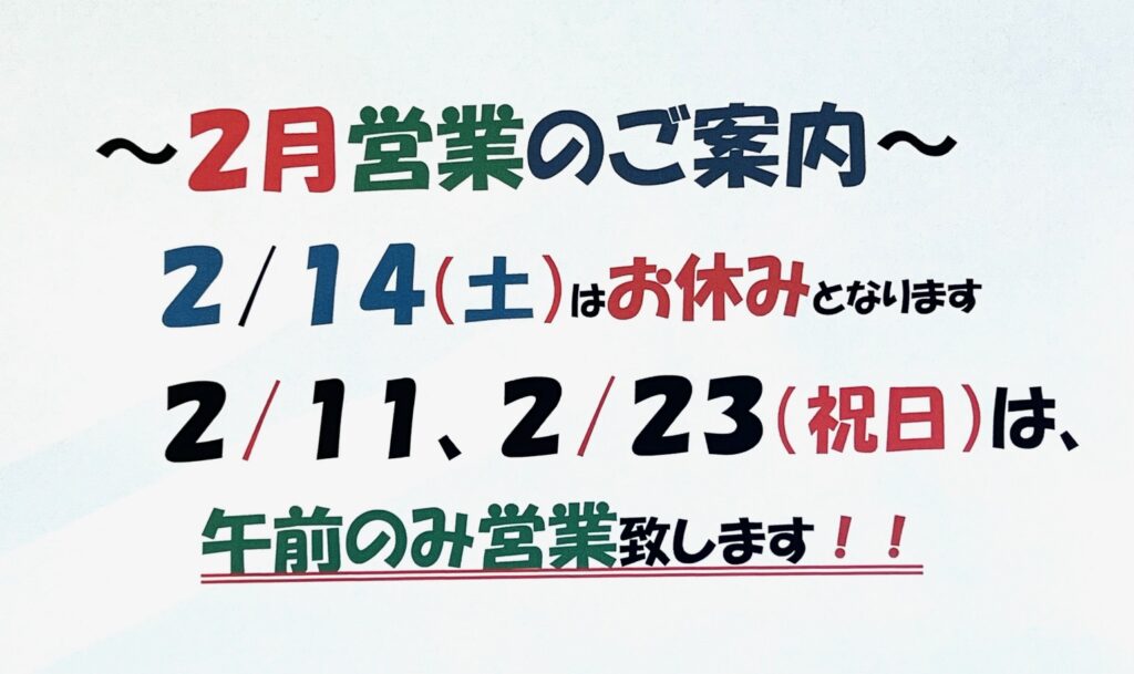 2/11㊗と2/23㊗は両日とも午前中のみ営業させて頂きます。
